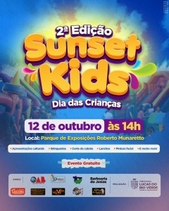 A Prefeitura de Lucas do Rio Verde convida a população para participar da 2ª edição do Sunset Kids, em comemoração ao Dia das Crianças. O evento será realizado no dia 12 de outubro, das 14h, às 18h, no Parque de Exposições Roberto Munaretto e vai oferecer muita diversão para a criançada luverdense.