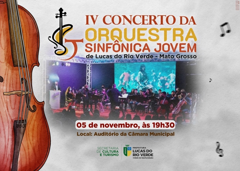 A Secretaria de Cultura e Turismo de Lucas do Rio Verde convida a população para prestigiar o IV Concerto da Orquestra Sinfônica Jovem. O evento será realizado neste sábado (05), às 19h30, no auditório da Câmara Municipal, na Avenida Pará, nº 359 E, bairro Cidade Nova.