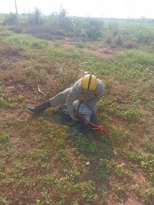 O militar utilizou a rede de captura para contenção e amarrações no bico, patas e na asas do animal, pois o mesmo se encontrava agressivo na cena.