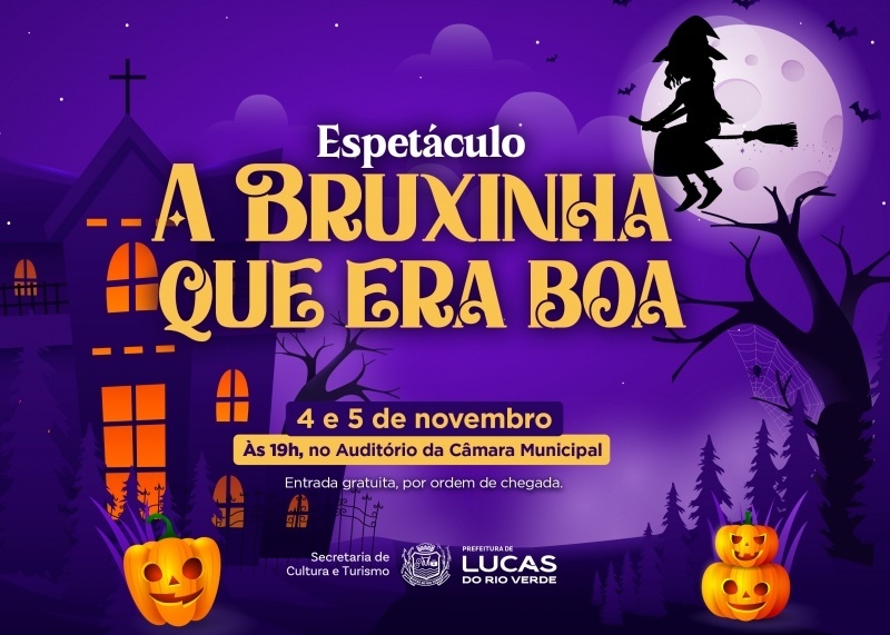 A Prefeitura de Lucas do Rio Verde, por meio da Secretaria de Cultura e Turismo, realizará nos dias 4 e 5 de novembro, às 19h, na Câmara de Vereadores, a apresentação do espetáculo “A Bruxinha que Era Boa”, uma adaptação do clássico infantil de Maria Clara Machado.