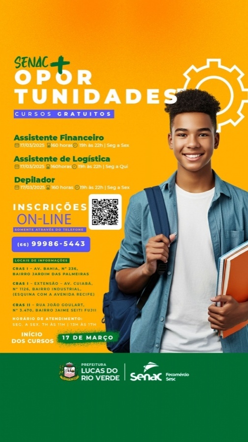 Três cursos gratuitos de qualificação profissional estão com inscrições abertas. A iniciativa é oferecida pelo Programa Senac Mais Oportunidades, uma ação da Prefeitura de Lucas do Rio Verde, por meio da Secretaria de Assistência Social e Habitação, em parceria com o Serviço Nacional de Aprendizagem Comercial (Senac).