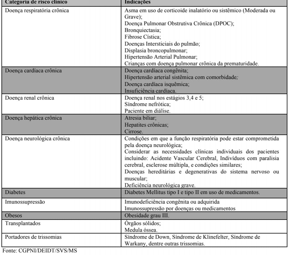 • Pessoas com comorbidades (doenças: respiratória crônica, cardíaca crônica, renal crônica, hepática crônica, neurológica crônica, diabetes, imunossupressão, transplantados, portadores de trissomias)