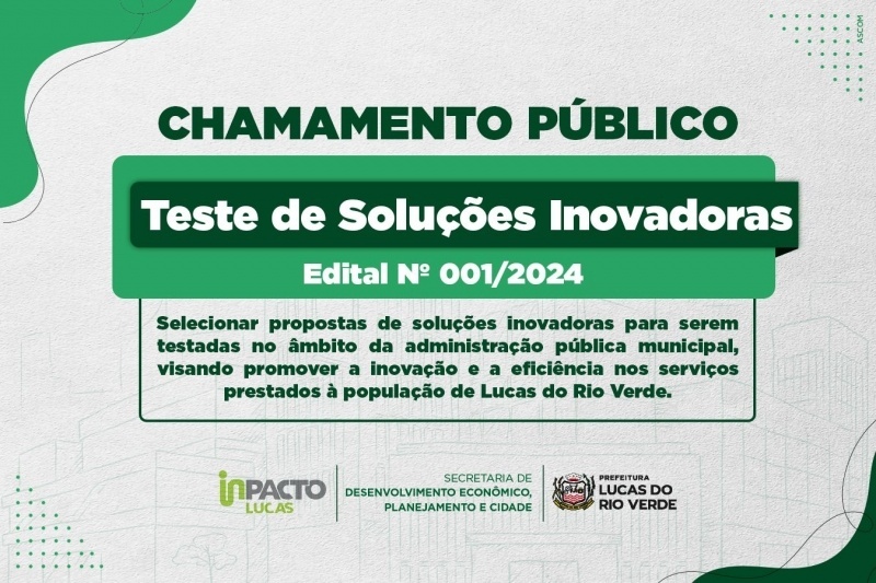 A Prefeitura de Lucas do Rio Verde, por meio da Secretaria de Desenvolvimento Econômico, Planejamento e Cidade e departamento de inovação, está com inscrições abertas, para o Chamamento Público para Teste de Soluções Inovadoras, por meio do Edital nº 001/2024.