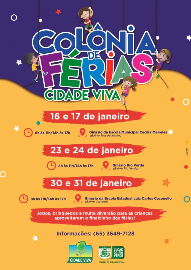 A Prefeitura de Lucas do Rio Verde, por meio da Secretaria de Esporte e Lazer, promove a partir da próxima semana mais uma edição da Colônia de Férias Cidade Viva. As atividades serão realizadas em três locais diferentes da cidade.