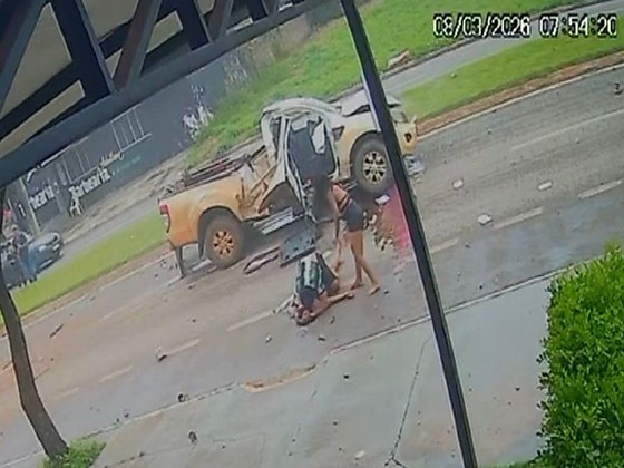 Uma caminhonete colidiu violentamente contra dois postes de energia na Avenida Noêmia Dalmolin, em Sorriso (378 km de Cuiabá), em Mato Grosso. O impacto, registrado por câmeras de segurança, foi tão forte que a frente do veículo ficou completamente destruída e a fiação elétrica foi derrubada na pista.