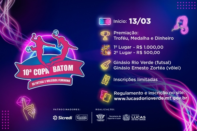 No mês das mulheres, o esporte também realiza um evento dedicado à classe feminina, a tradicional Copa Batom de Futsal e Voleibol Feminino 2026, que chega a sua 10ª edição com três dias de competição e premiação em dinheiro.