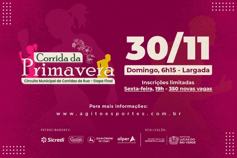 A Corrida de Primavera é uma realização da Prefeitura de Lucas do Rio Verde, organizada pela Secretaria de Esporte e Lazer. O evento acontecerá no dia 30 de novembro, com largada marcada para às 6h15, no Lago Ernani José Machado.