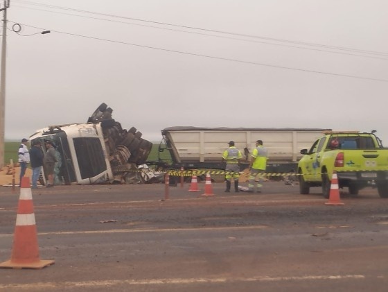 Um motorista morreu e outro ficou ferido em uma batida entre duas carretas na manhã de hoje (30), no km 614 da BR-163, em Nova Mutum (264 km de Cuiabá), Mato Grosso.