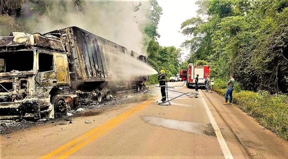 Carreta pega fogo e carga de carne é totalmente consumida pelas chamas