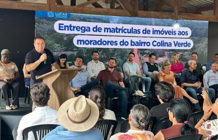 Os vereadores da Câmara Municipal de Lucas do Rio Verde participaram, na quinta-feira (15), da entrega oficial das matrículas de imóveis da primeira etapa da Regularização Fundiária Urbana (Reurb) do bairro Colina Verde. O evento, promovido pela Prefeitura Municipal, foi realizado na Chácara do Vasconcelos e marcou um momento histórico para as famílias da localidade.