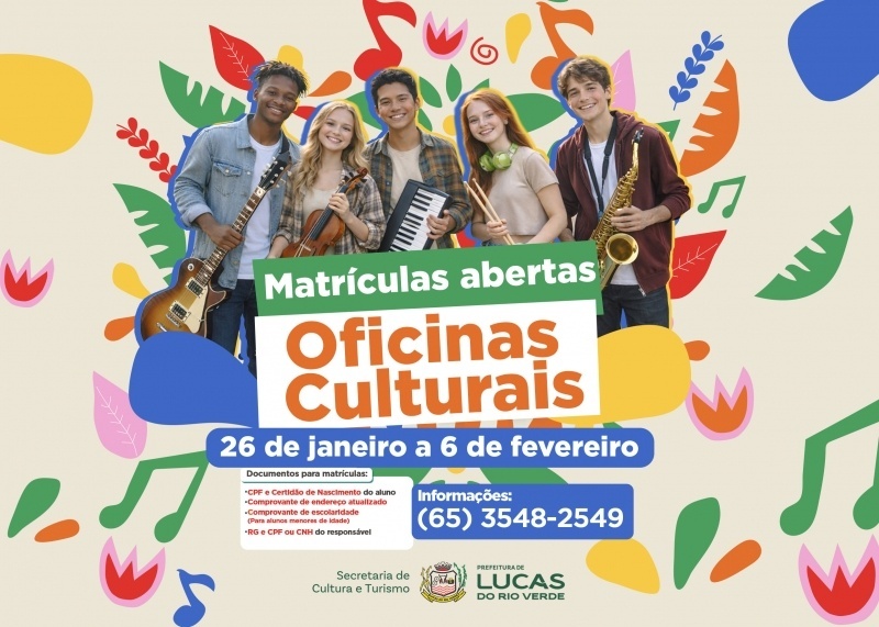 A Prefeitura de Lucas do Rio Verde, por meio da Secretaria de Cultura e Turismo, informa que estão abertas as matrículas para as Oficinas Culturais 2026. Os interessados podem se inscrever até o dia 6 de fevereiro, exclusivamente pela internet, por meio do link: