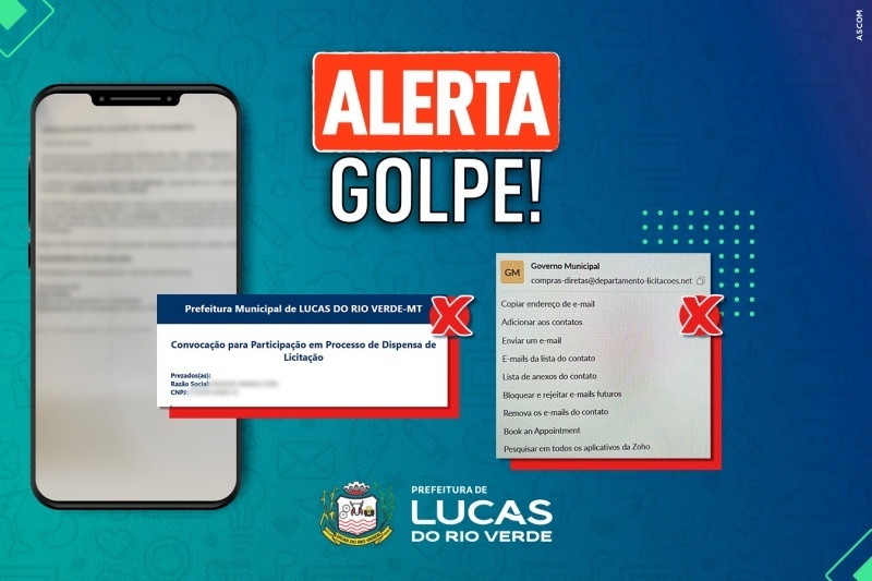 A Prefeitura de Lucas do Rio Verde alerta que tem recebido denúncias sobre um e-mail falso enviado a empresas, que simula processos de Solicitação de Cotação e de Convocação para Participação em Dispensa de Licitação.