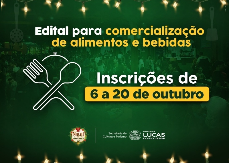 A Prefeitura de Lucas do Rio Verde, por meio da Secretaria Municipal de Cultura e Turismo, informa que estão abertas as inscrições do Edital Nº 07/2025, que trata da comercialização de alimentos e bebidas na Praça de Alimentação do Natal da Esperança 2025.