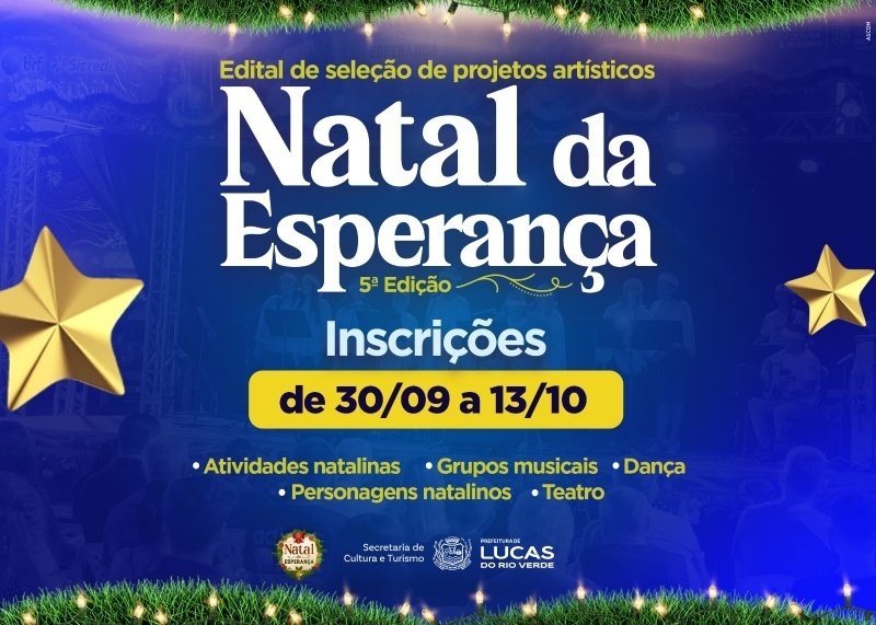 A Prefeitura de Lucas do Rio Verde, por meio da Secretaria Municipal de Cultura e Turismo, lança oficialmente o Edital Nº 06/2025 do Natal da Esperança (5ª edição). A iniciativa amplia seu alcance e contempla, neste ano, pessoas físicas e jurídicas de direito privado, fortalecendo a diversidade cultural e artística do município.