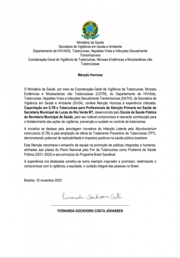 A “Capacitação em ILTB e Tuberculose para Profissionais da Atenção Primária em Saúde”, promovida pela Escola de Saúde Pública de Lucas do Rio Verde, foi uma das experiências exitosas premiadas pelo Ministério da Saúde.