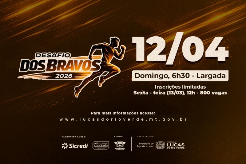 A Prefeitura de Lucas do Rio Verde, por meio da Secretaria de Esporte e Lazer, também lançará um desafio de corrida de aventura para o público masculino, a exemplo do Desafio das Destemidas, voltado para as mulheres luverdenses. O Desafio dos Bravos acontecerá no dia 12 de abril, com percurso que inclui corrida com obstáculos, trilha e muita diversão em pista irregular e pavimentada.