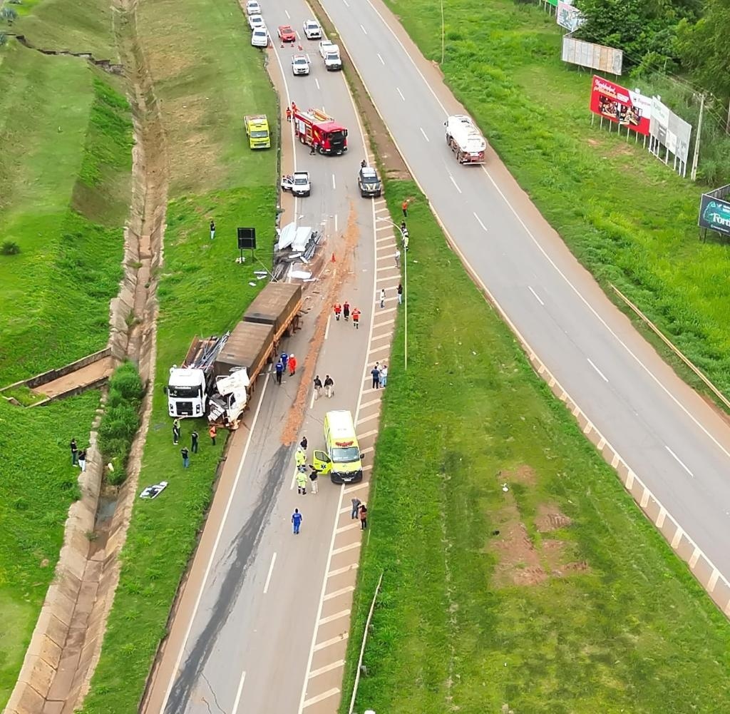 O 5º Batalhão de Bombeiros Militar (5º BBM) foi acionado via 193 e prontamente se deslocou até o endereço. Ao chegar, a equipe constatou que havia ocorrido uma colisão entre três veículos de carga, sendo uma carreta e dois caminhões, e que, no momento do acidente, apenas os motoristas estavam nos veículos.